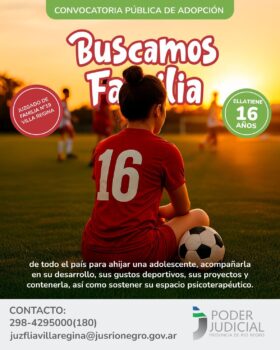 El Juzgado de Familia de Villa Regina, a través del Registro Único de Aspirantes a Guarda con Fines Adoptivos, convoca a familias interesadas en adoptar a una adolescente de 16 años.