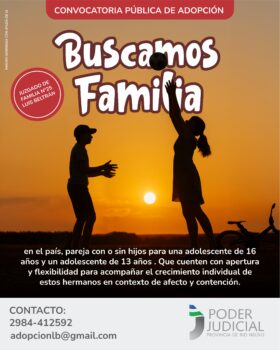Buscamos familia en el país, pareja con o sin hijos que cuenten con apertura y flexibilidad, para acompañar el crecimiento individual de estos hermanos en contexto de afecto y contención. La familia deberá acompañar la asistencia escolar primaria y secundaria, a actividades recreativas, así como también sostener el apoyo psicopedagógico al cual asiste uno de ellos. Todas las Familias que se sientan en condiciones de ahijar de manera adecuada a sus necesidades pueden inscribirse a través del formulario digital