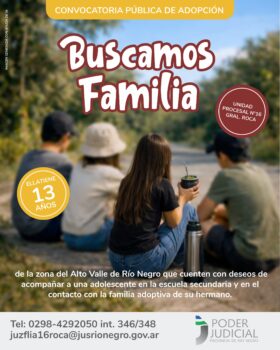La Unidad Procesal N° 16 del Fuero de Familia de Roca, a través del Registro Único de Aspirantes a Guarda con Fines Adoptivos, convoca a familias que deseen adoptar a una adolescente de 13 años de edad.
