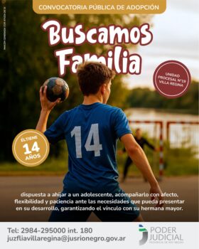 El Juzgado de Familia de Villa Regina, a través del Registro Único de Aspirantes a Guarda con Fines Adoptivos, convoca a familias que deseen adoptar a un adolescente de 14 años.