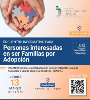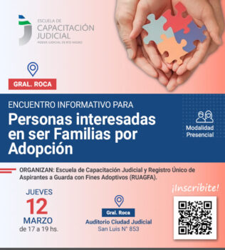 En Roca se realizará un encuentro informativo destinado a personas interesadas en ser familias por adopción. Tendrá lugar el 12 de marzo, de 17 a 19, en el Auditorio de la Ciudad Judicial, San Luis N.º 853.